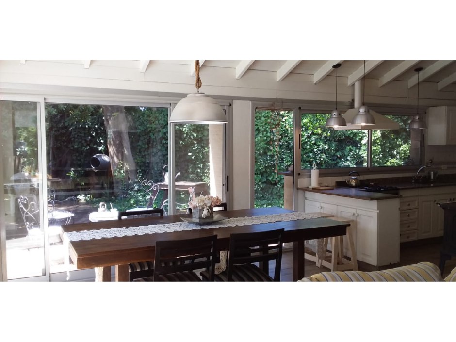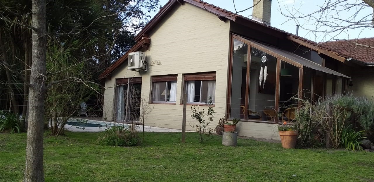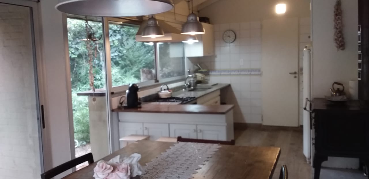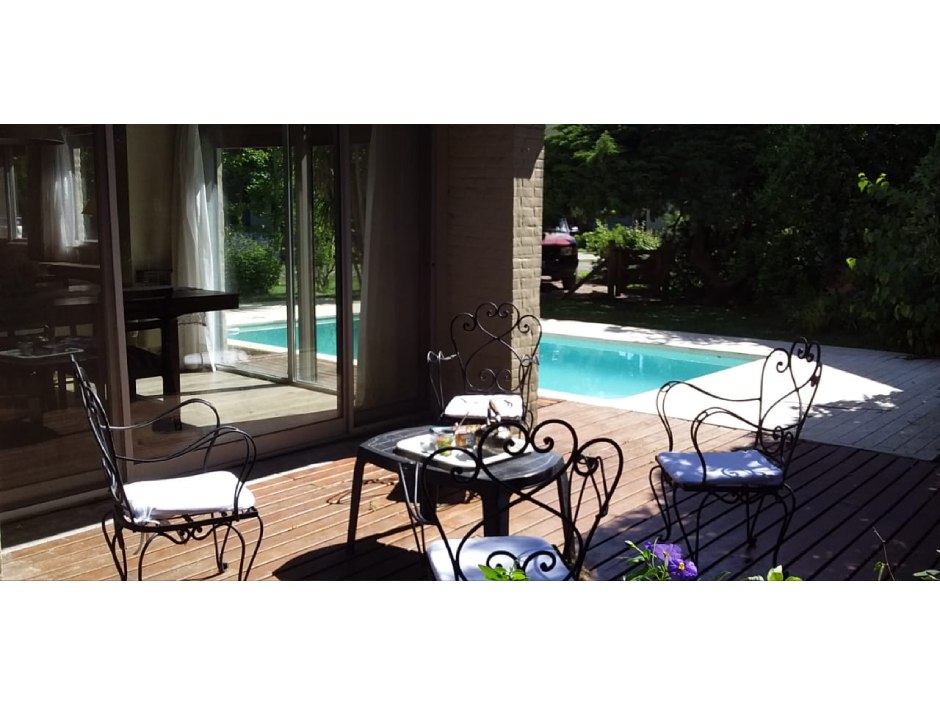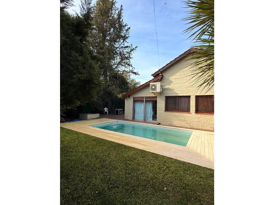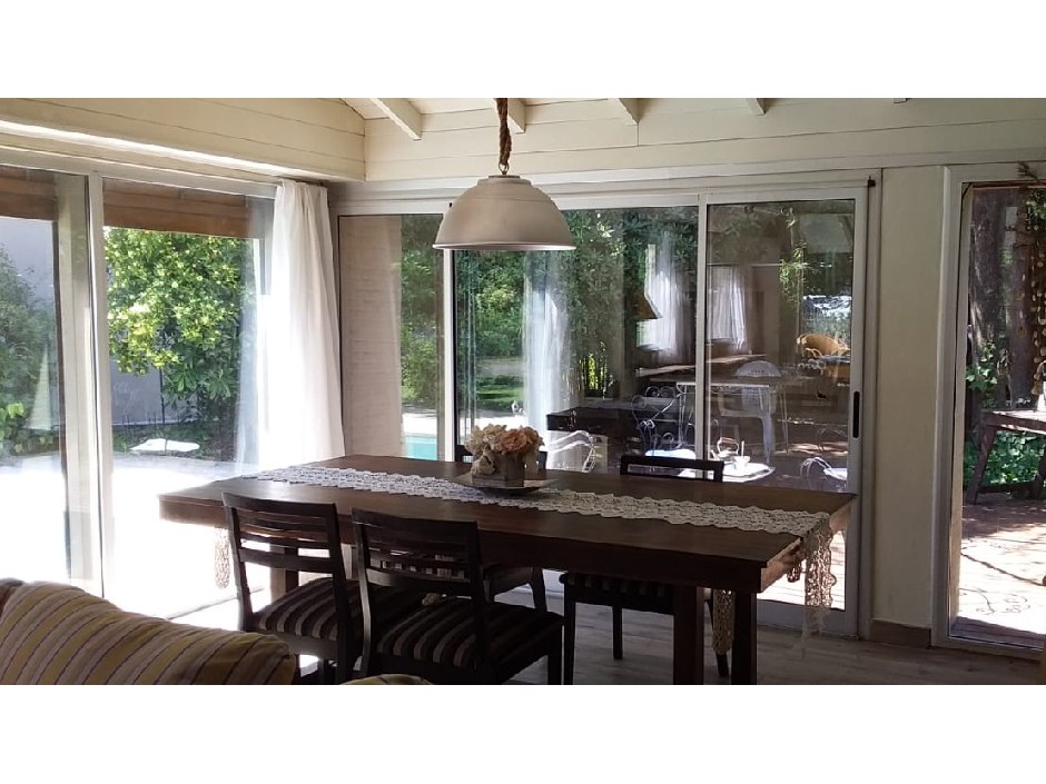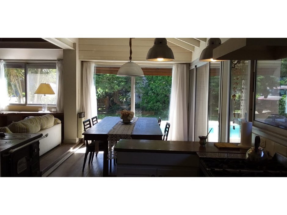 Chalet desarrollado principalmente en una planta sobre dos lotes. Hall de recepción y estar vidriado con estructura de pinotea y buenas vistas, gran living de 7,30x4,20 en doble altura, con cielorraso de pino Brasil y hogar a leña con frente vidriado tipo tromen, comedor integrado a la cocina de 7x3 con vistas al parque y a la piscina, cocina separada por una barra con muebles completos en madera pintada de blanco y mesada de granito, cocina industrial, preparado para colocar lavavajillas. A continuación, el lavadero con salida independiente y tender de techo. Pisos de porcelanato italiano símil entablonado de madera de 1,70x20 y pinotea en los dormitorios. El dormitorio principal con dos placares y baño en suite revestido en piedra parís al igual que la mesada y gran espejo. Los otros dos dormitorios con placard. Segundo baño completo con mesada de granito negra y gran espejo. En planta alta gran ambiente de 30m2 muy luminoso para hacer home office, play room y/o 4to. dormitorio con muchos espacios de guardado y secador de ropa. A la planta alta se accede por una escalera caracol realizada en hierro. La climatización es por equipos de aire acondicionado frio calor en el living y estar de entrada, calefactor de 13.000 k/cal. en el estar principal y dormitorios (con conducto), hogar a leña y estufas de tiro balanceado. Exterior: gran deck que conecta el sector de parrilla con la salida desde el comedor y piscina de 6x3 con solado perimetral atérmico de 24m2. Frente a la fachada principal 2 ginkgo bilova.