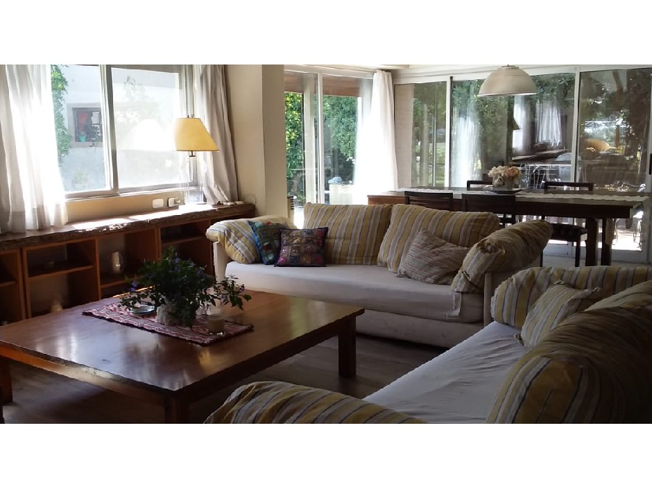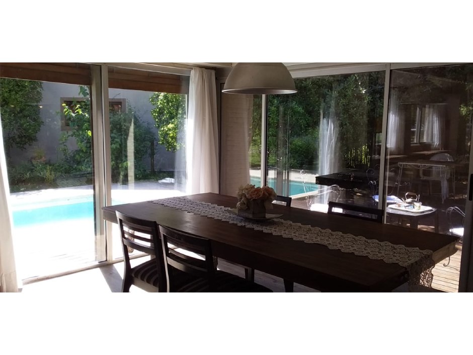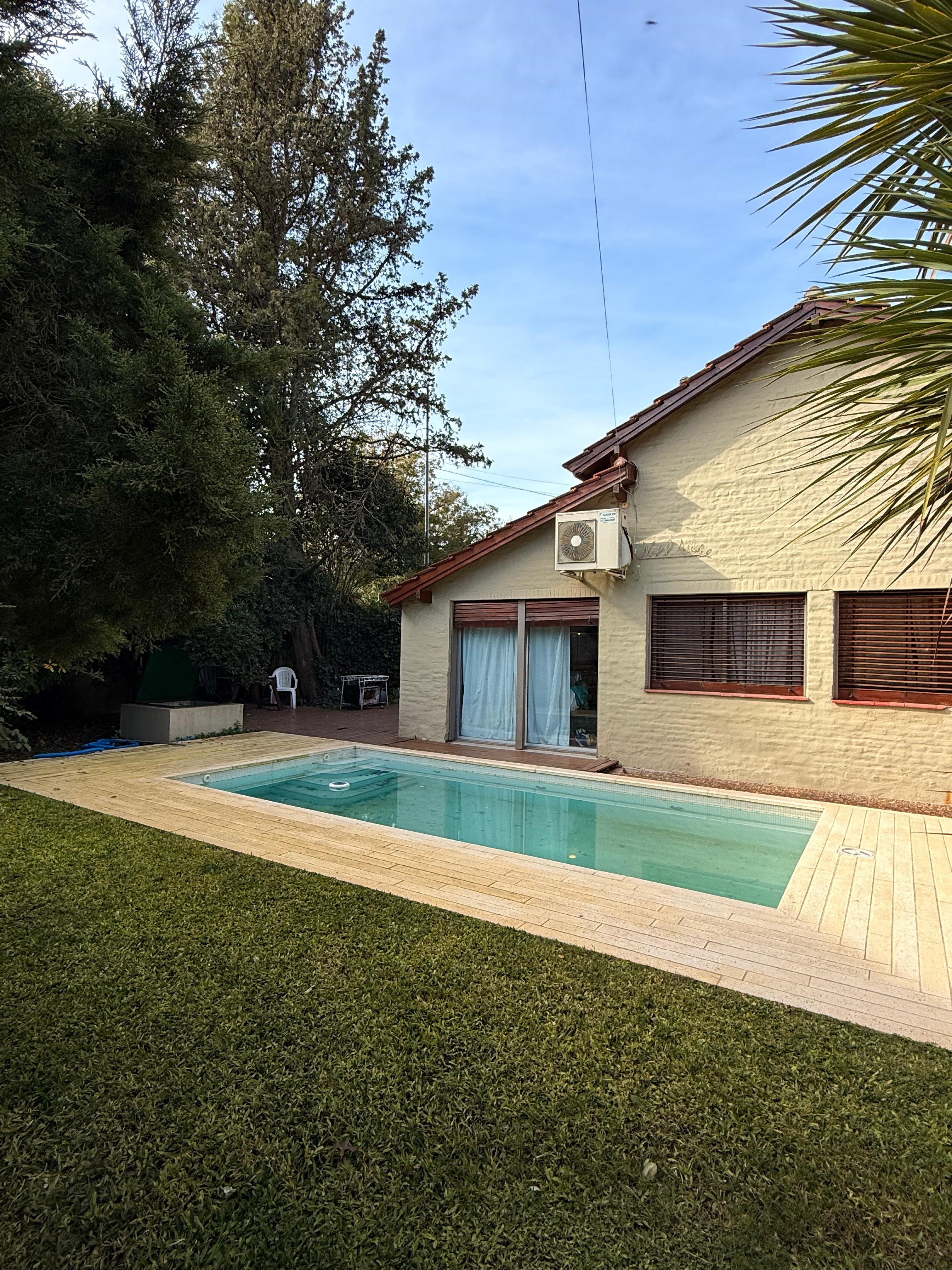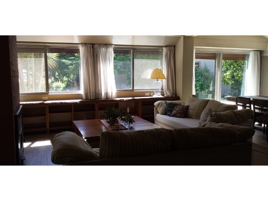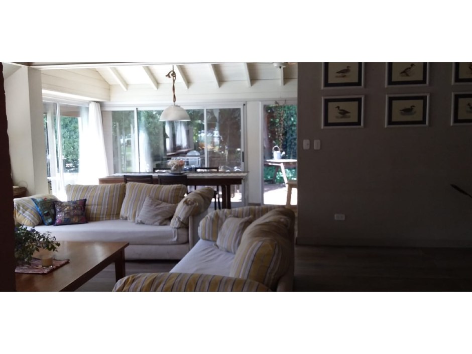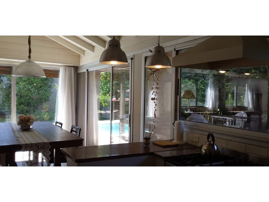 Chalet desarrollado principalmente en una planta sobre dos lotes. Hall de recepción y estar vidriado con estructura de pinotea y buenas vistas, gran living de 7,30x4,20 en doble altura, con cielorraso de pino Brasil y hogar a leña con frente vidriado tipo tromen, comedor integrado a la cocina de 7x3 con vistas al parque y a la piscina, cocina separada por una barra con muebles completos en madera pintada de blanco y mesada de granito, cocina industrial, preparado para colocar lavavajillas. A continuación, el lavadero con salida independiente y tender de techo. Pisos de porcelanato italiano símil entablonado de madera de 1,70x20 y pinotea en los dormitorios. El dormitorio principal con dos placares y baño en suite revestido en piedra parís al igual que la mesada y gran espejo. Los otros dos dormitorios con placard. Segundo baño completo con mesada de granito negra y gran espejo. En planta alta gran ambiente de 30m2 muy luminoso para hacer home office, play room y/o 4to. dormitorio con muchos espacios de guardado y secador de ropa. A la planta alta se accede por una escalera caracol realizada en hierro. La climatización es por equipos de aire acondicionado frio calor en el living y estar de entrada, calefactor de 13.000 k/cal. en el estar principal y dormitorios (con conducto), hogar a leña y estufas de tiro balanceado. Exterior: gran deck que conecta el sector de parrilla con la salida desde el comedor y piscina de 6x3 con solado perimetral atérmico de 24m2. Frente a la fachada principal 2 ginkgo bilova.