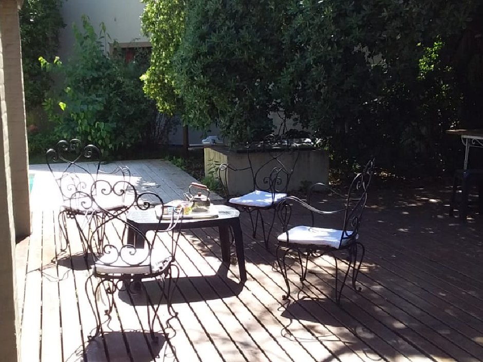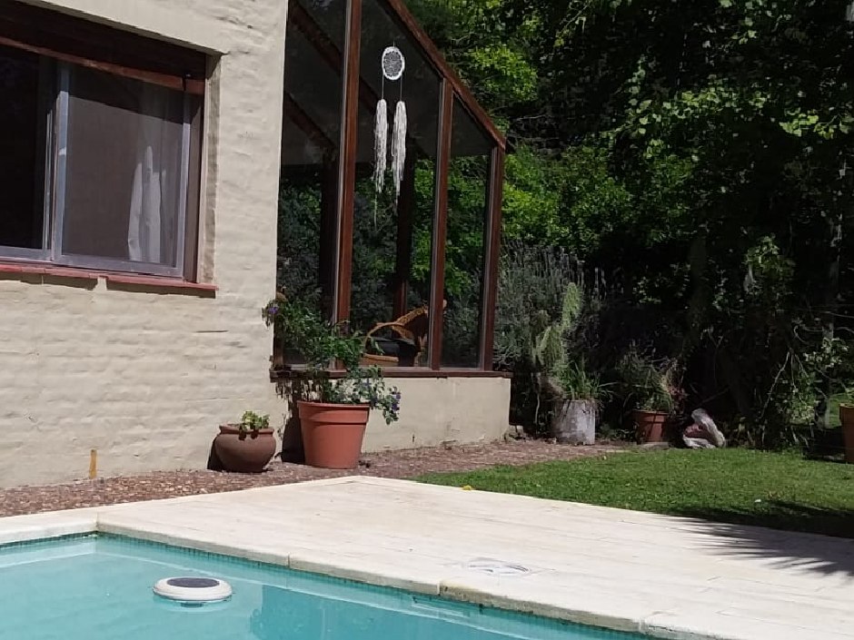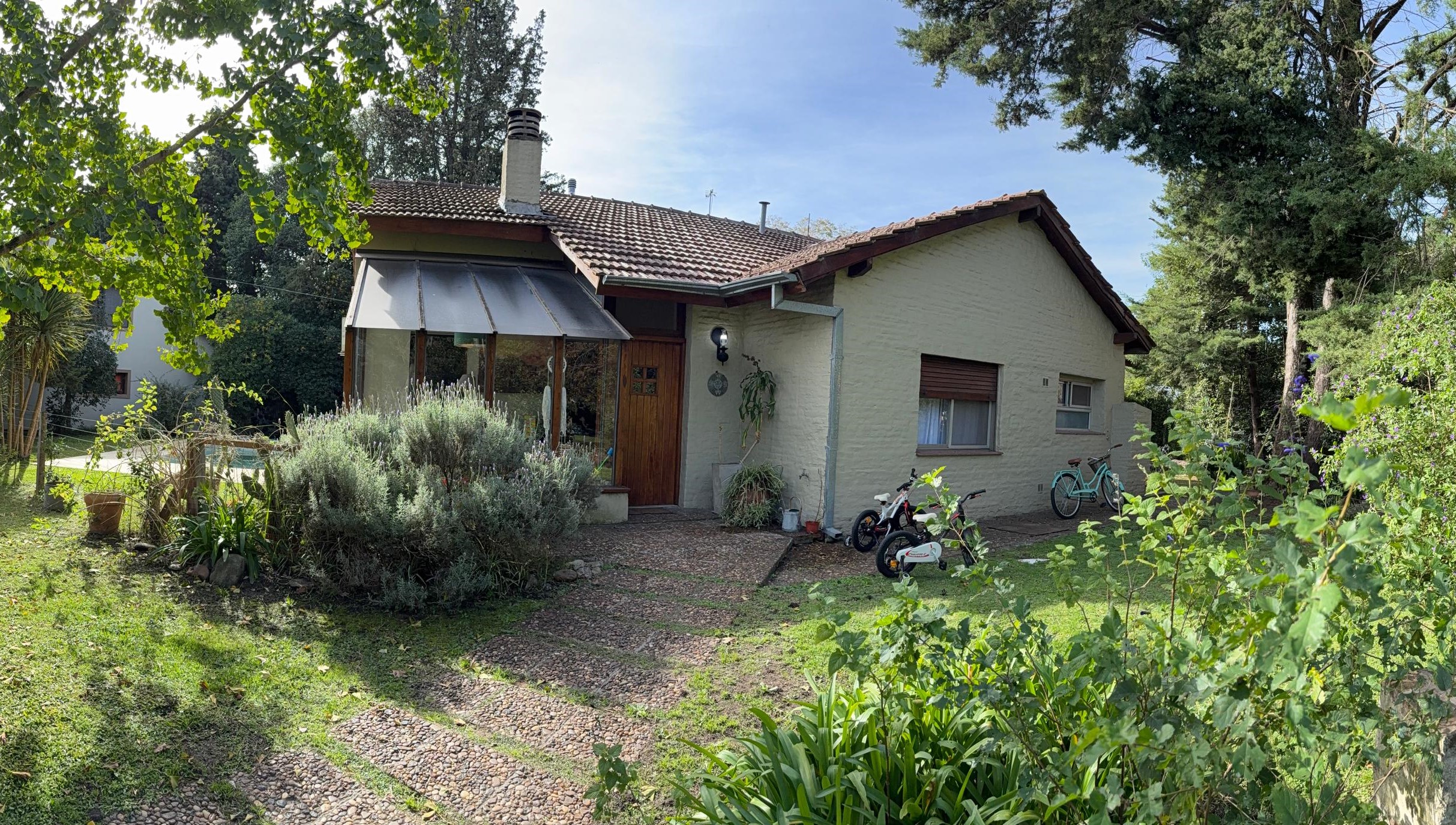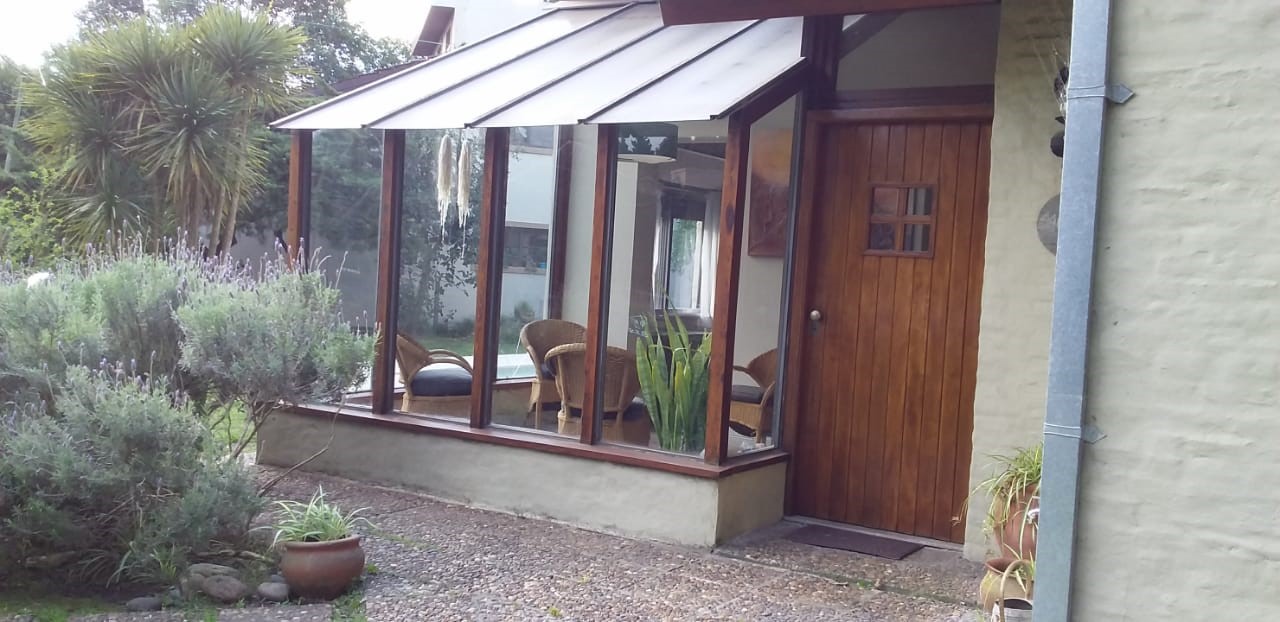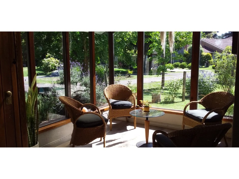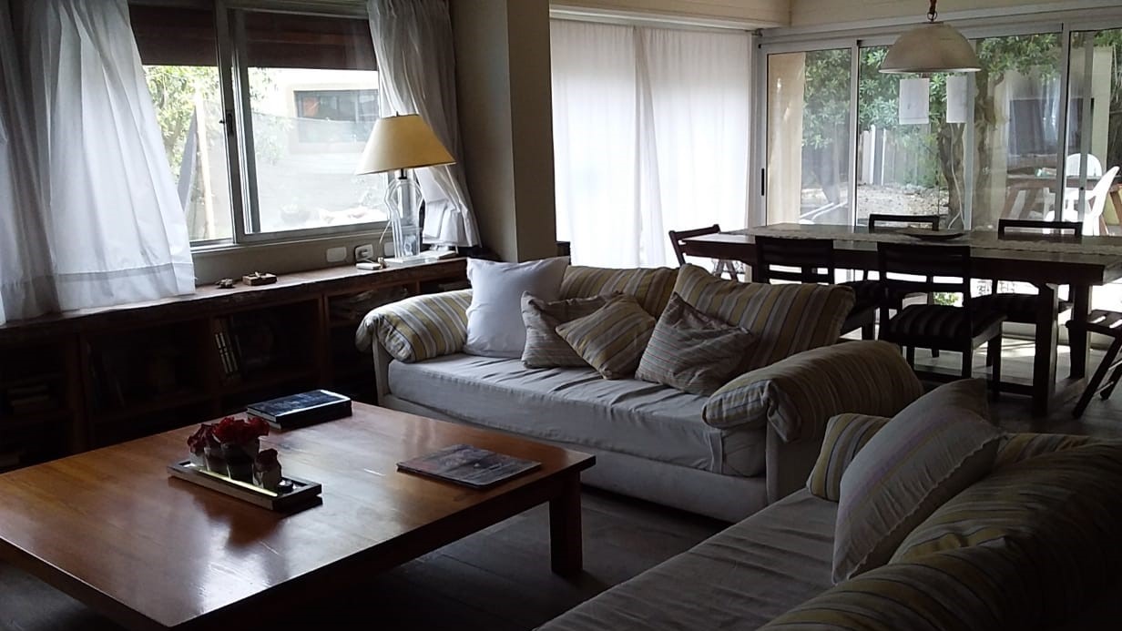 Chalet desarrollado principalmente en una planta sobre dos lotes. Hall de recepción y estar vidriado con estructura de pinotea y buenas vistas, gran living de 7,30x4,20 en doble altura, con cielorraso de pino Brasil y hogar a leña con frente vidriado tipo tromen, comedor integrado a la cocina de 7x3 con vistas al parque y a la piscina, cocina separada por una barra con muebles completos en madera pintada de blanco y mesada de granito, cocina industrial, preparado para colocar lavavajillas. A continuación, el lavadero con salida independiente y tender de techo. Pisos de porcelanato italiano símil entablonado de madera de 1,70x20 y pinotea en los dormitorios. El dormitorio principal con dos placares y baño en suite revestido en piedra parís al igual que la mesada y gran espejo. Los otros dos dormitorios con placard. Segundo baño completo con mesada de granito negra y gran espejo. En planta alta gran ambiente de 30m2 muy luminoso para hacer home office, play room y/o 4to. dormitorio con muchos espacios de guardado y secador de ropa. A la planta alta se accede por una escalera caracol realizada en hierro. La climatización es por equipos de aire acondicionado frio calor en el living y estar de entrada, calefactor de 13.000 k/cal. en el estar principal y dormitorios (con conducto), hogar a leña y estufas de tiro balanceado. Exterior: gran deck que conecta el sector de parrilla con la salida desde el comedor y piscina de 6x3 con solado perimetral atérmico de 24m2. Frente a la fachada principal 2 ginkgo bilova.