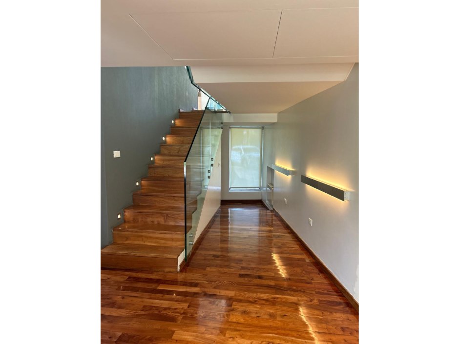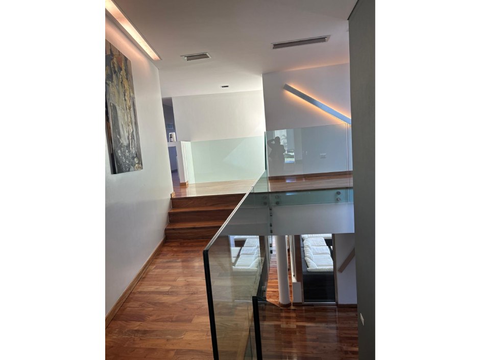 Moderna casa de 3 dormitorios más escritorio y dependencias con espectacular vista al golf. Subsuelo: garaje para cuatro autos cómodos y cuatro en línea (sup. 110m2) pisos mosaicos y paredes revestidas en venecitas blancas. Portón automatizado. Área de servicio: pisos en porcelanato. Sala de máquinas. Despensa. Lavadero. Dormitorio de servicio. Patio Inglés con escalera en madera con salida directa al jardín. Planta Baja: Pisos en madera Viraró entablonada hidrolaqueados. Recibidor con techo de vidrio antigranizo. Living Comedor con hogar con protección en blindex. Toilette. Cocina- comedor diario con mesada de Silestone, muebles a medida, cocina industrial de 5 hornallas, purificador de aire en acero inoxidable a medida, grandes ventanales al jardín. Planta Alta: Pisos de madera Viraró entablonada. Escritorio con puertas de vidrio. Dormitorio principal en suite con vestidor; baño con box de ducha y bañera con hidromasaje , revestido en venecitas. Dos dormitorios con placard , balcón, un baño completo también con revestimiento en venecitas. Amplia terraza . En exterior: cómoda galería con parrilla y horno a leña con cerramiento en acero inoxidable. Barra con mesada y pileta ; mueble bajomesada. Piscina revestida en venecitas con cascada y jacuzzi. La casa es de hormigón con todos techos de yeso. Vidrios de barandas 10x10 con lámina de seguridad en el medio. Sistema central computarizada, Domotica (luz, sonido, aire etc). Pisos pocelanato español. Cerramiento de aluminio pulido A30. Puertas en cedro con herrajes italianos Meloni. Cortinas roller luxaflex con guía para automatizar. Calefacción central por radiadores (caldera dual) y equipo de refrigeración por aire frío-calor central sectorizado marca Daikin.